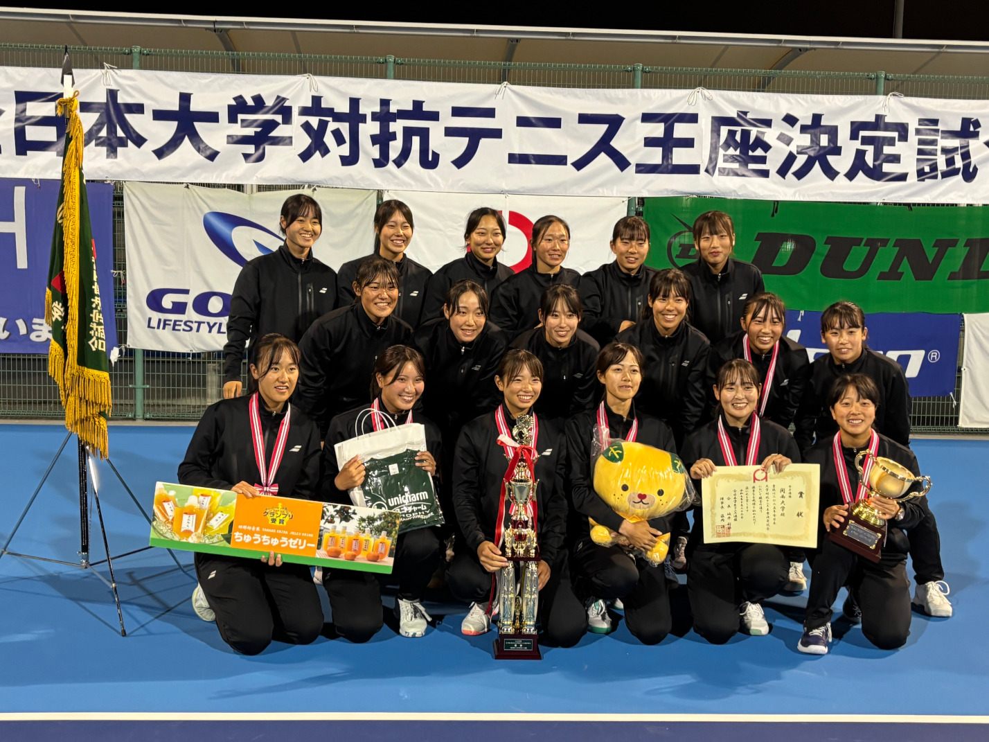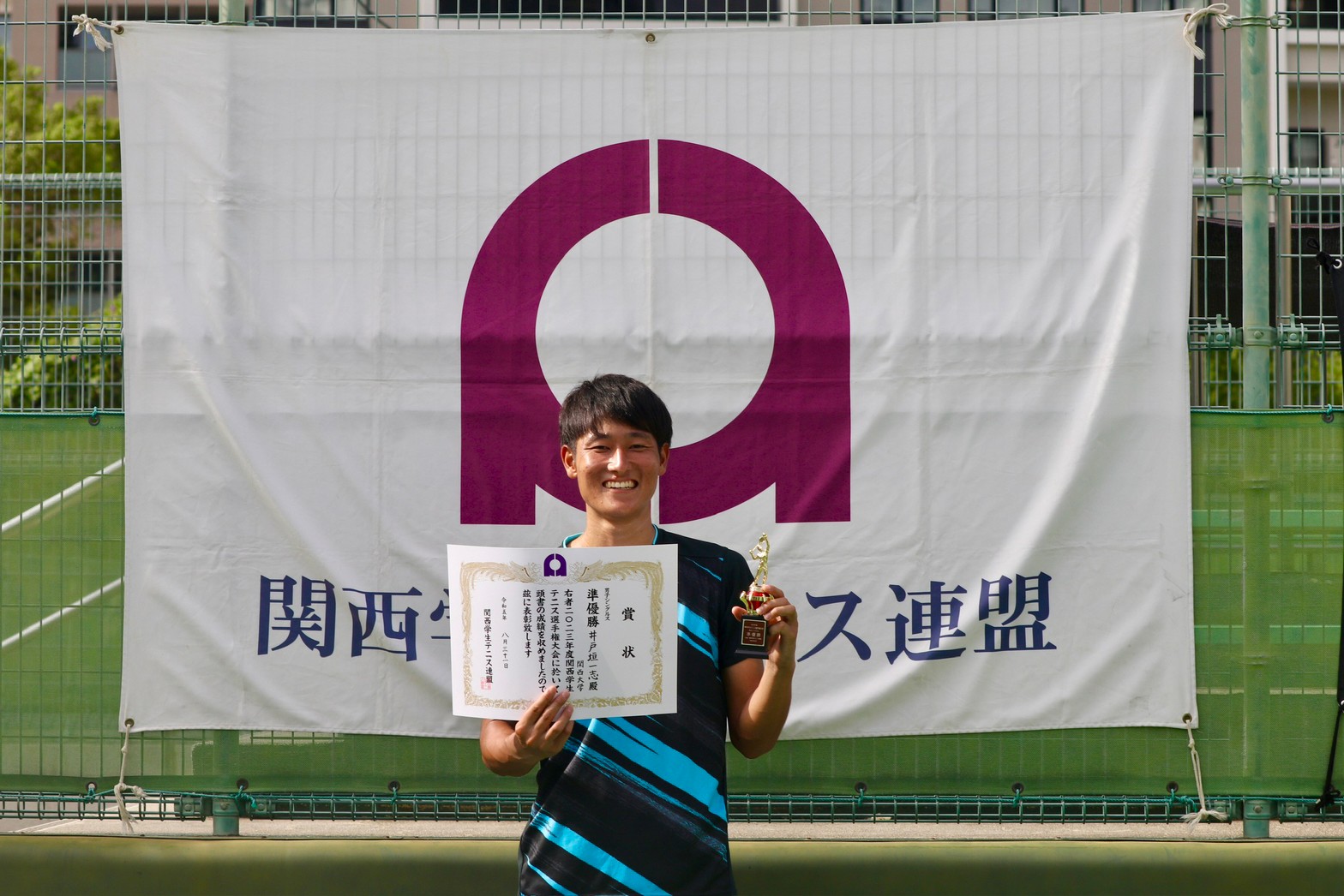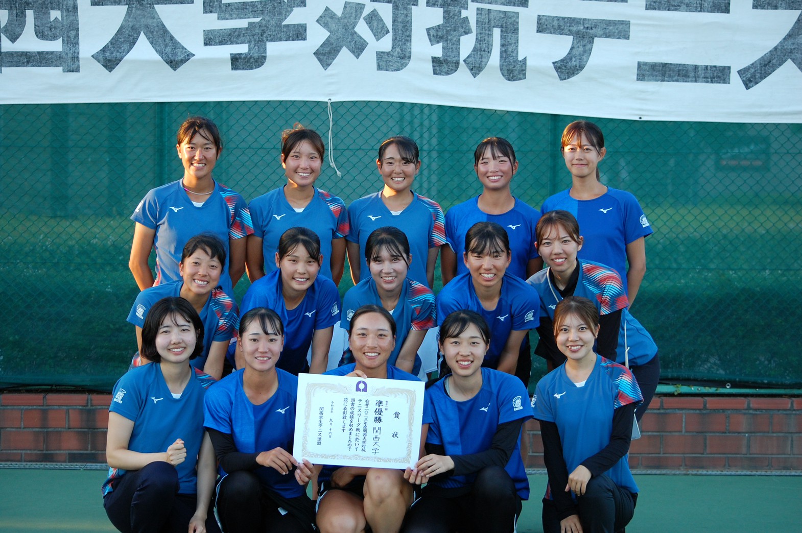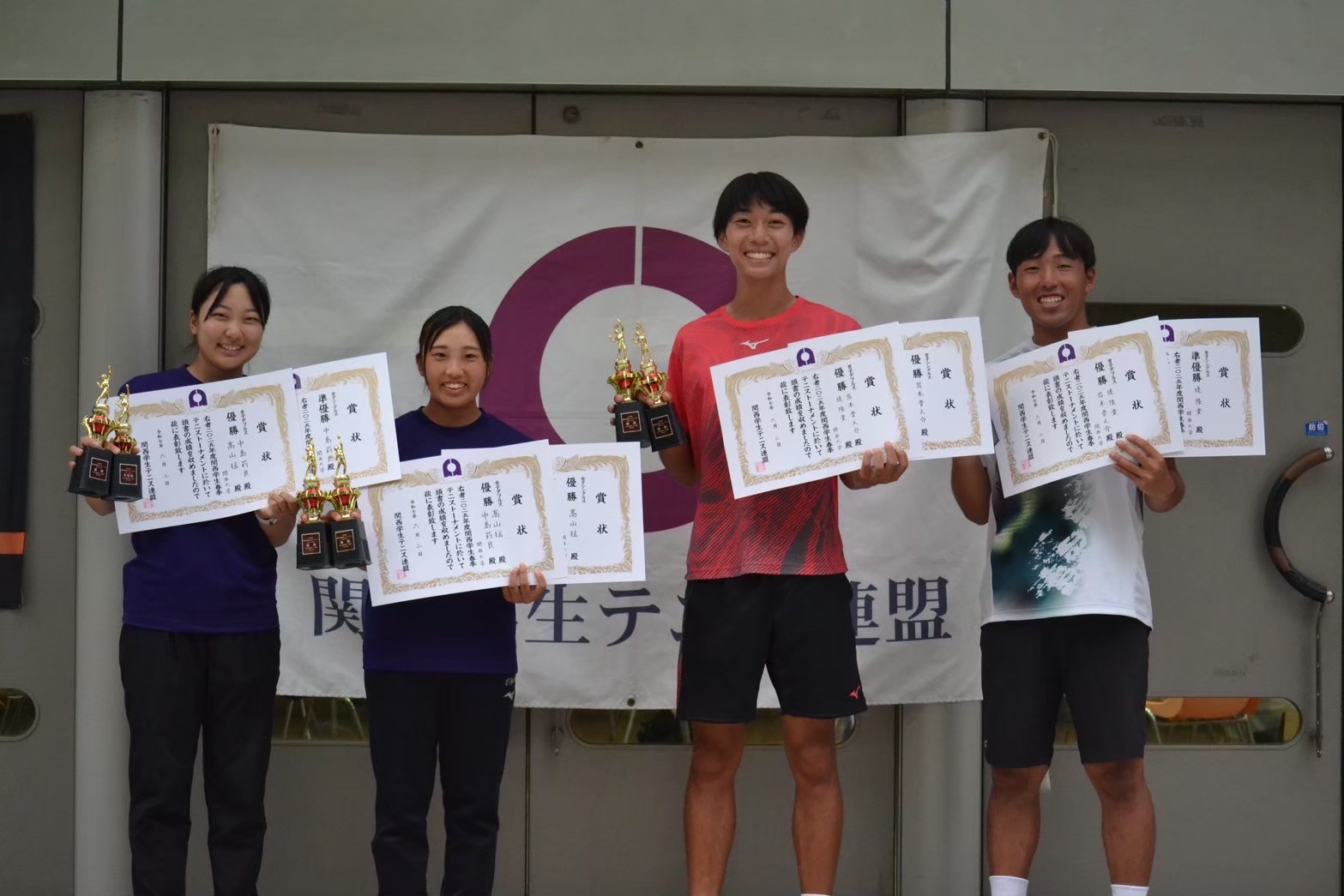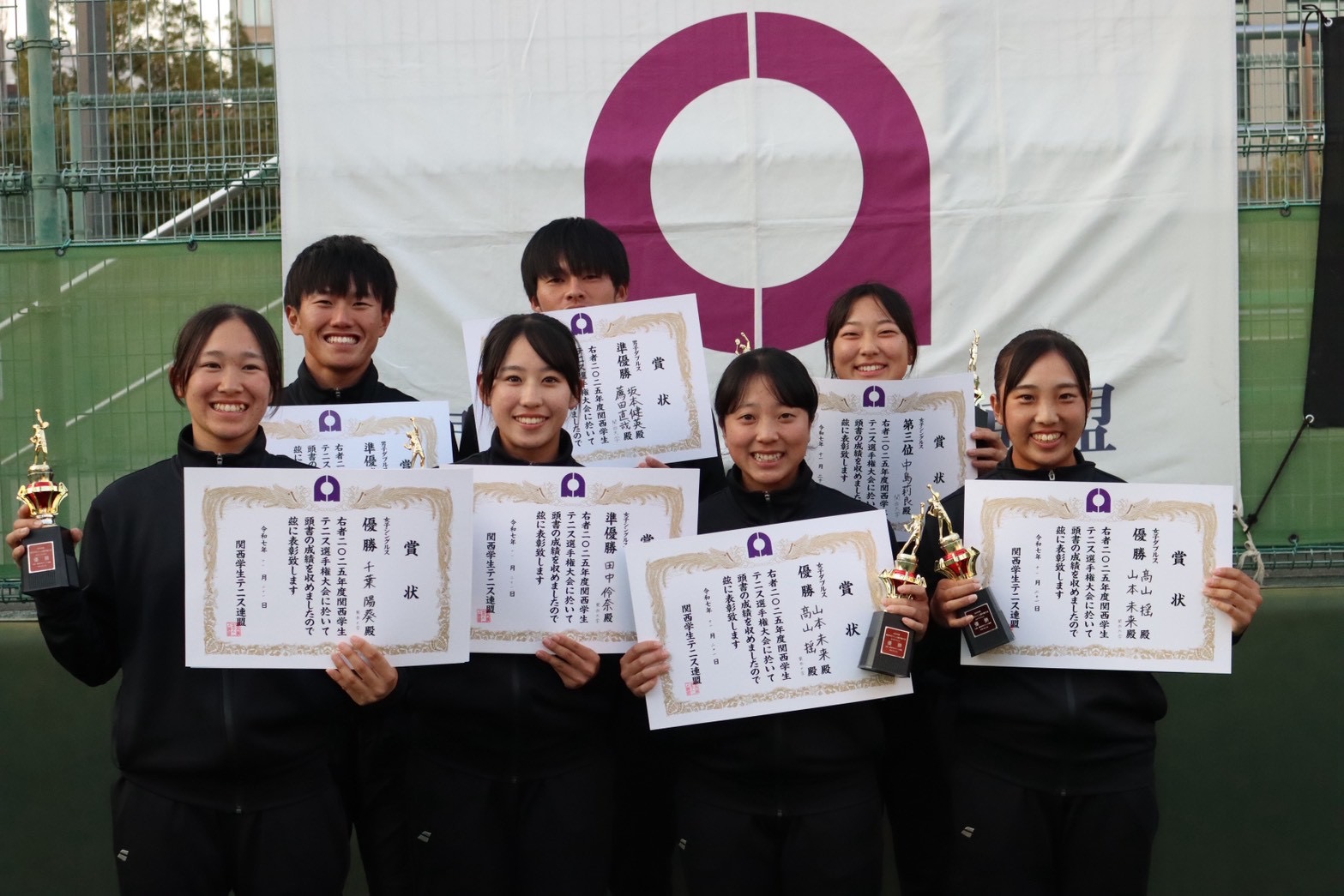 2025年 関西学生テニス選手権大会 男子シングルス準優勝 薦田直哉、男子ダブルス準優勝薦田・坂本組、女子シングルス優勝 千葉陽葵、女子シングルス準優勝 田中伶奈、女子ダブルス優勝 山本・髙山組