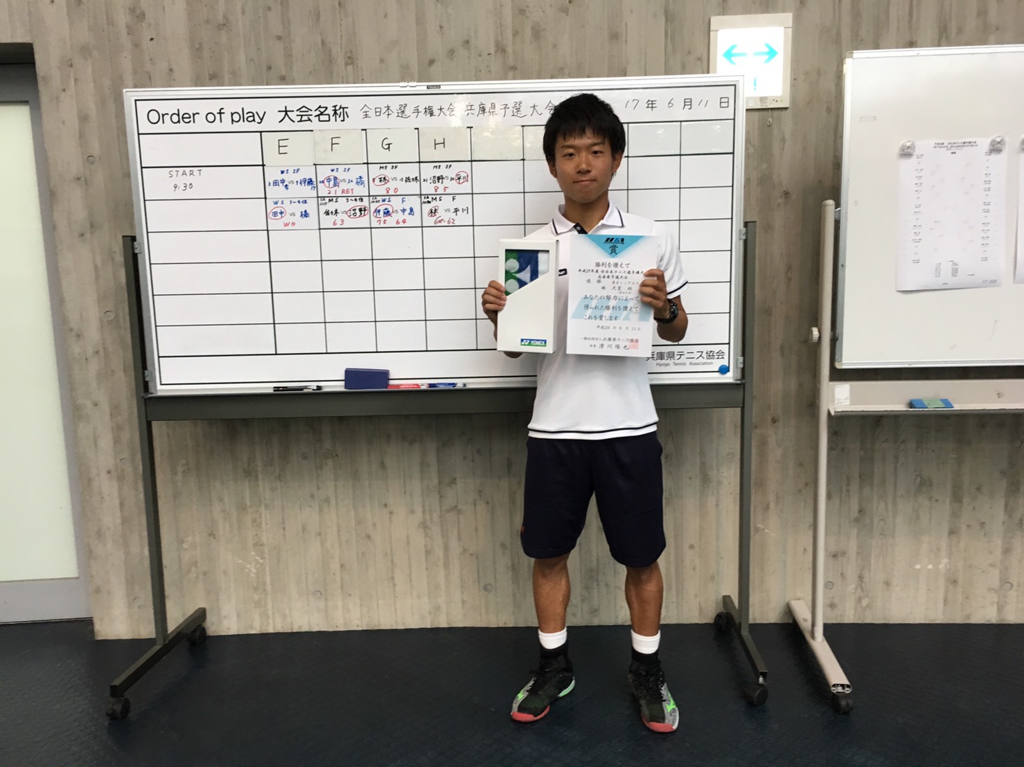全日本選手権大会兵庫県予選大会 2017年6月11日 kandai-tennis 試合速報 0 <男子シングルス準決勝> ○ 林 8−0 佐々木(相生学院高) <男子シングルス決勝> ◎ 林 6−0 6−2 平川(相生学院高) <女子シングルス準決勝> × 橘 1−2RET 中島(相生学院高)